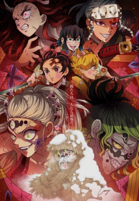 무한열차편은 염주인 렌고쿠 쿄주로가 귀살대 3인방인 탄지로, 이노스케와 젠이츠를 이끌었다면 환락의 거리편에서는 음주 우즈이 텐겐이 무한열차편에서 살아남은 탄지로, 이노스케, 젠이츠를 이끕니다.