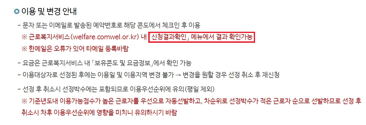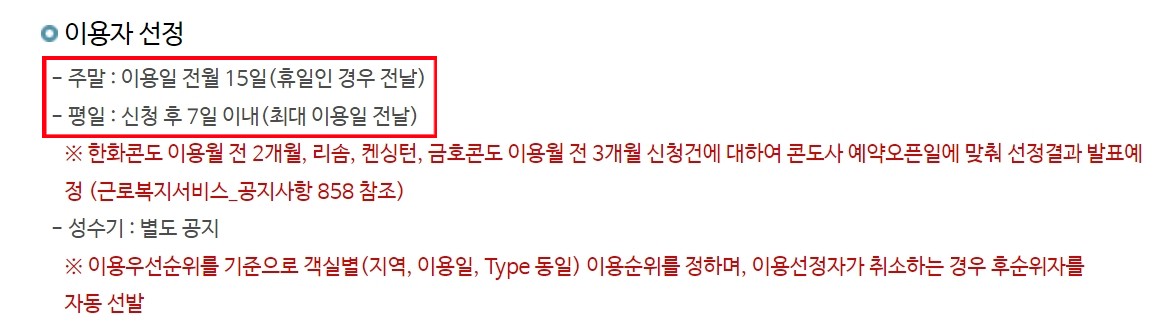 ◾ 이용자가 많을 때 - 이용 가능 점수가 높은 근로자, 주말 미 성수기 선정 박수가 적은 근로자, 나이가 많은 근로자를 우선으로 선정합니다. 만일 신혼여행의 경우라면 최우선으로 이용이 가능합니다.