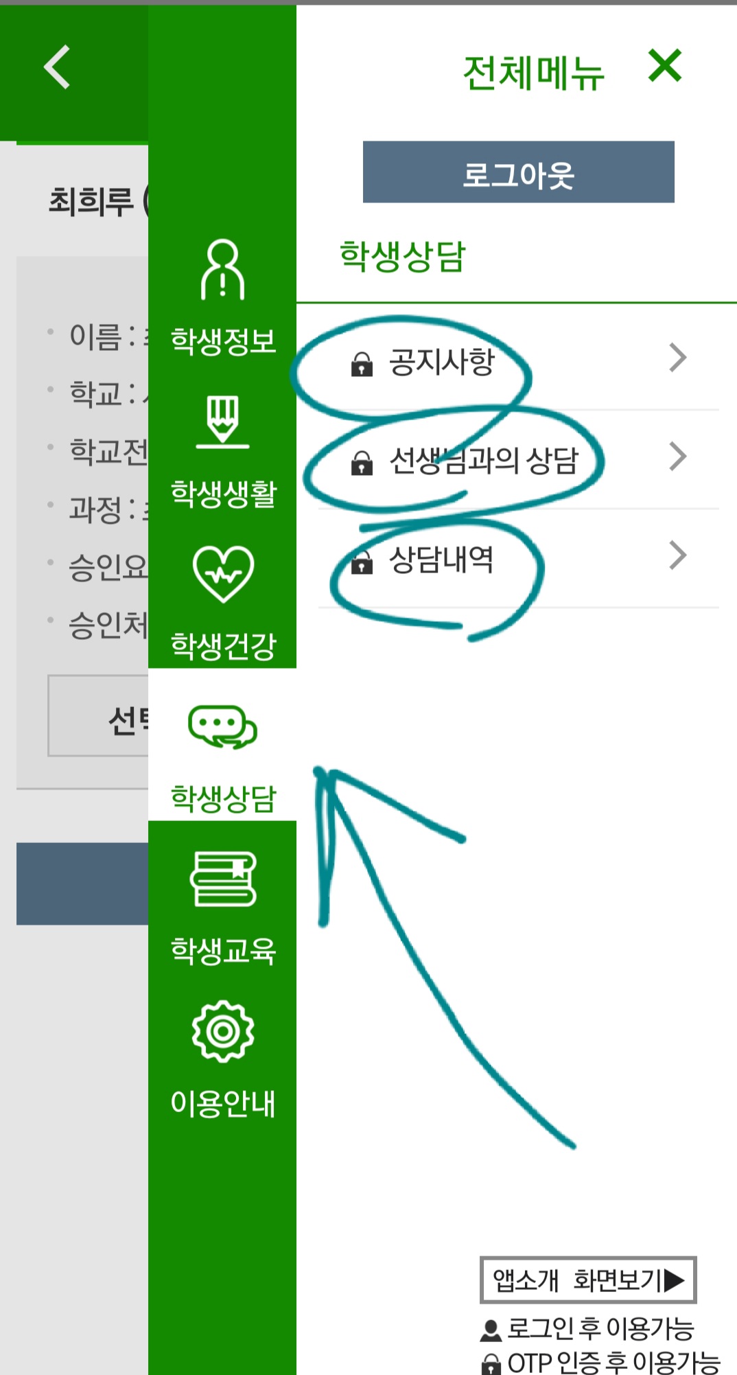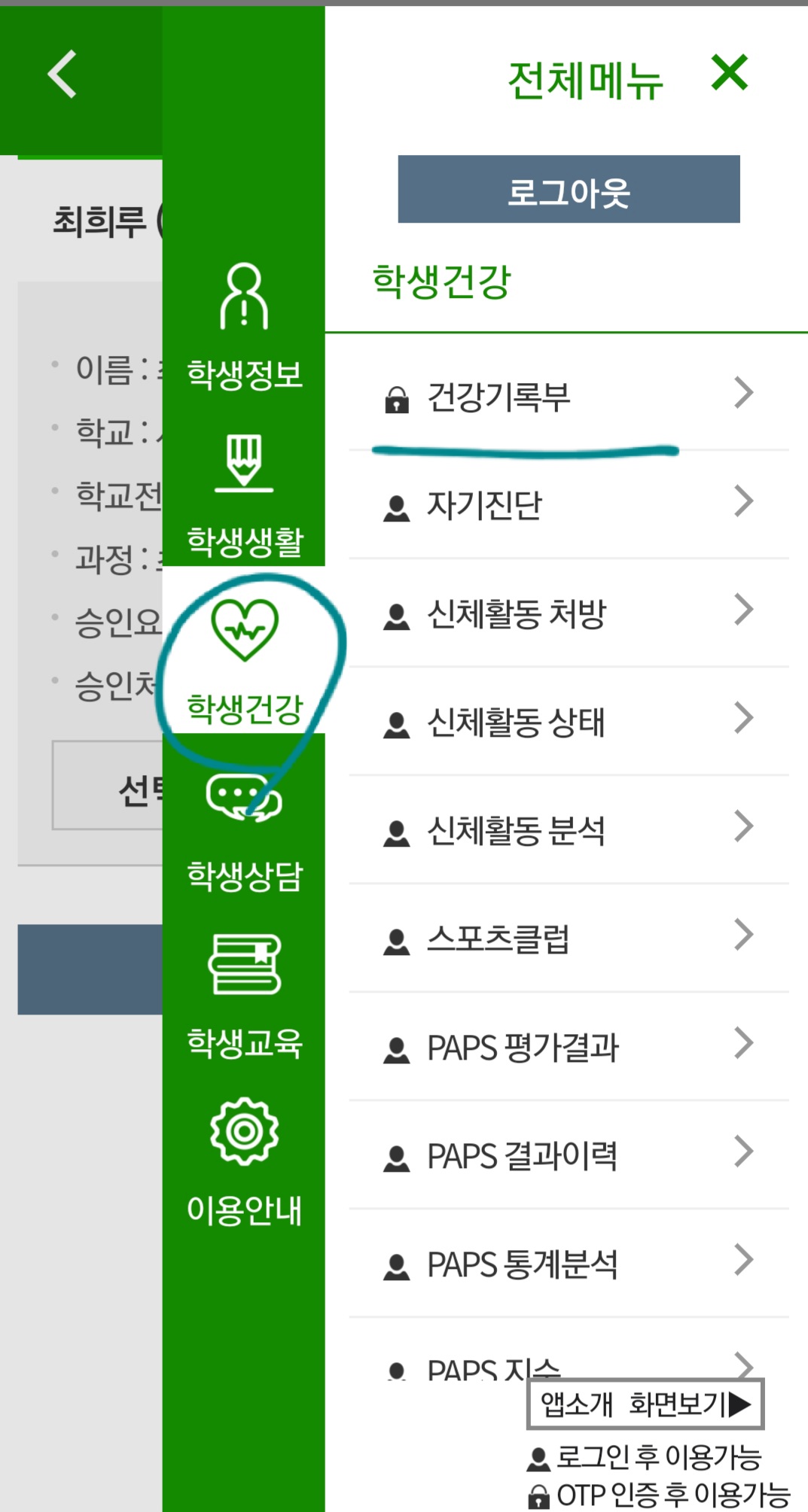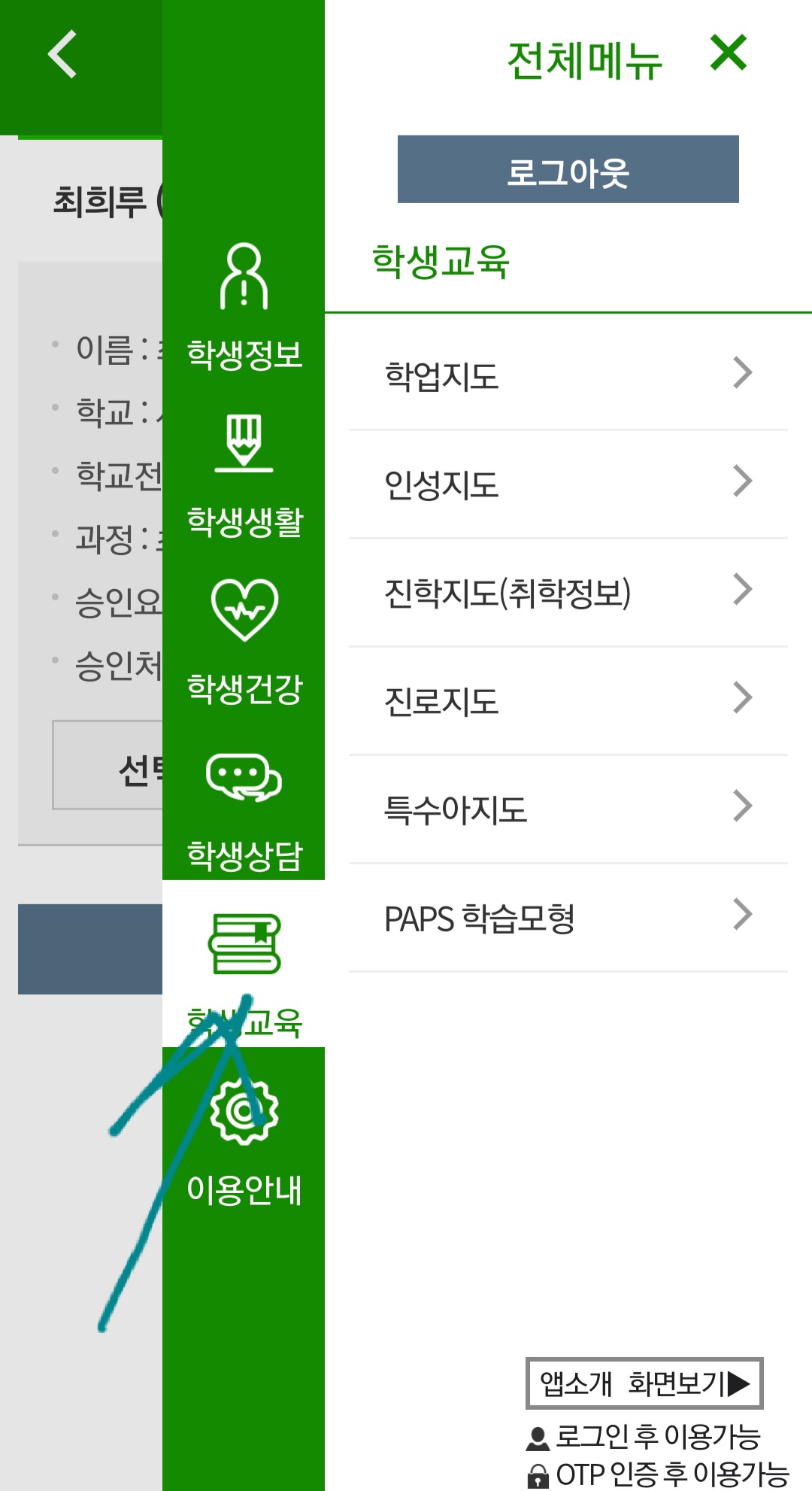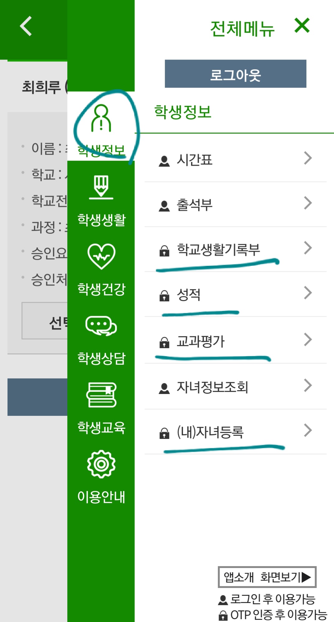시간표, 학사일정, 식단, 출석부등은 그냥 들어가 지는데 학교 생활기록부, 성적, 교과평가, 자녀등록 등 자물쇠가 있는 정보는 모두 OTP 번호가 필요하고 혹시나 저는 OTP번호를 넣다가 다섯 번이나 잘못넣어서 반드시 PC로 들어가야 하는 상황이 되었답니다.