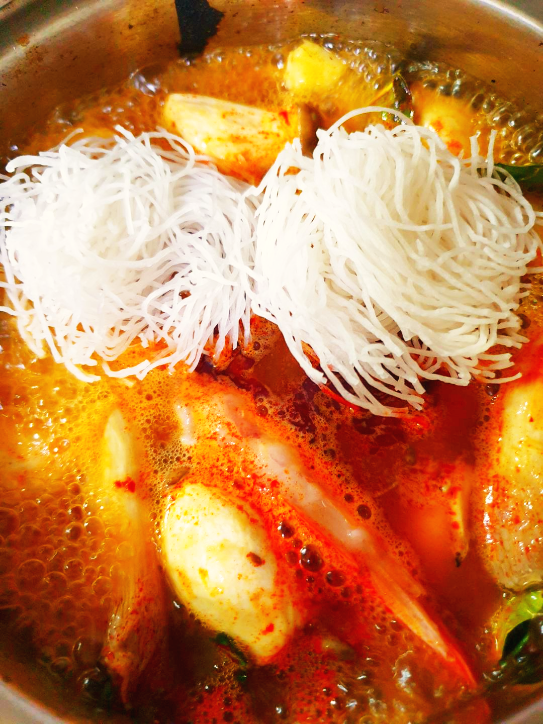 5) 새우와 굴, 당면을 추가해서 다시 강불에 3분간 끓입니다.