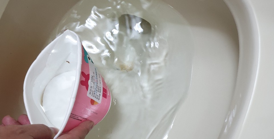 2) 변기의 잔여 물을 제거해 주고 남은 수분은 버릴 걸레로 잘 닦아서 물기가 없도록 만듭니다.