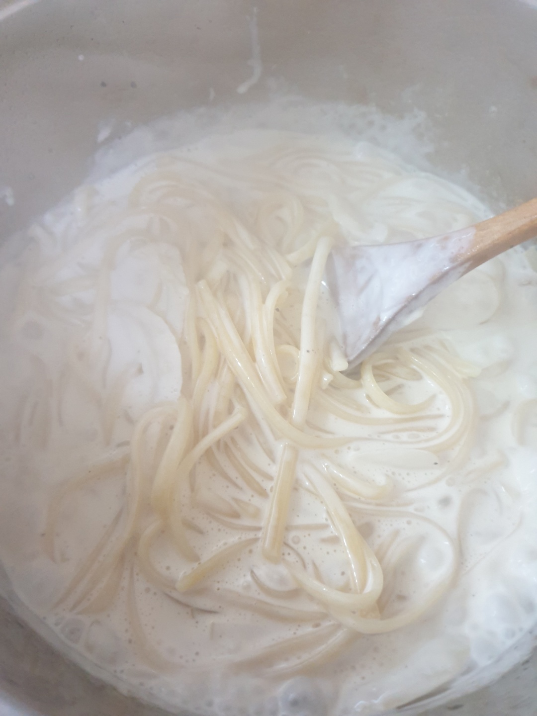 팬에 크림과 준비한 면수를 넣고 익은 면을 넣고 다시 중불에 볶습니다.