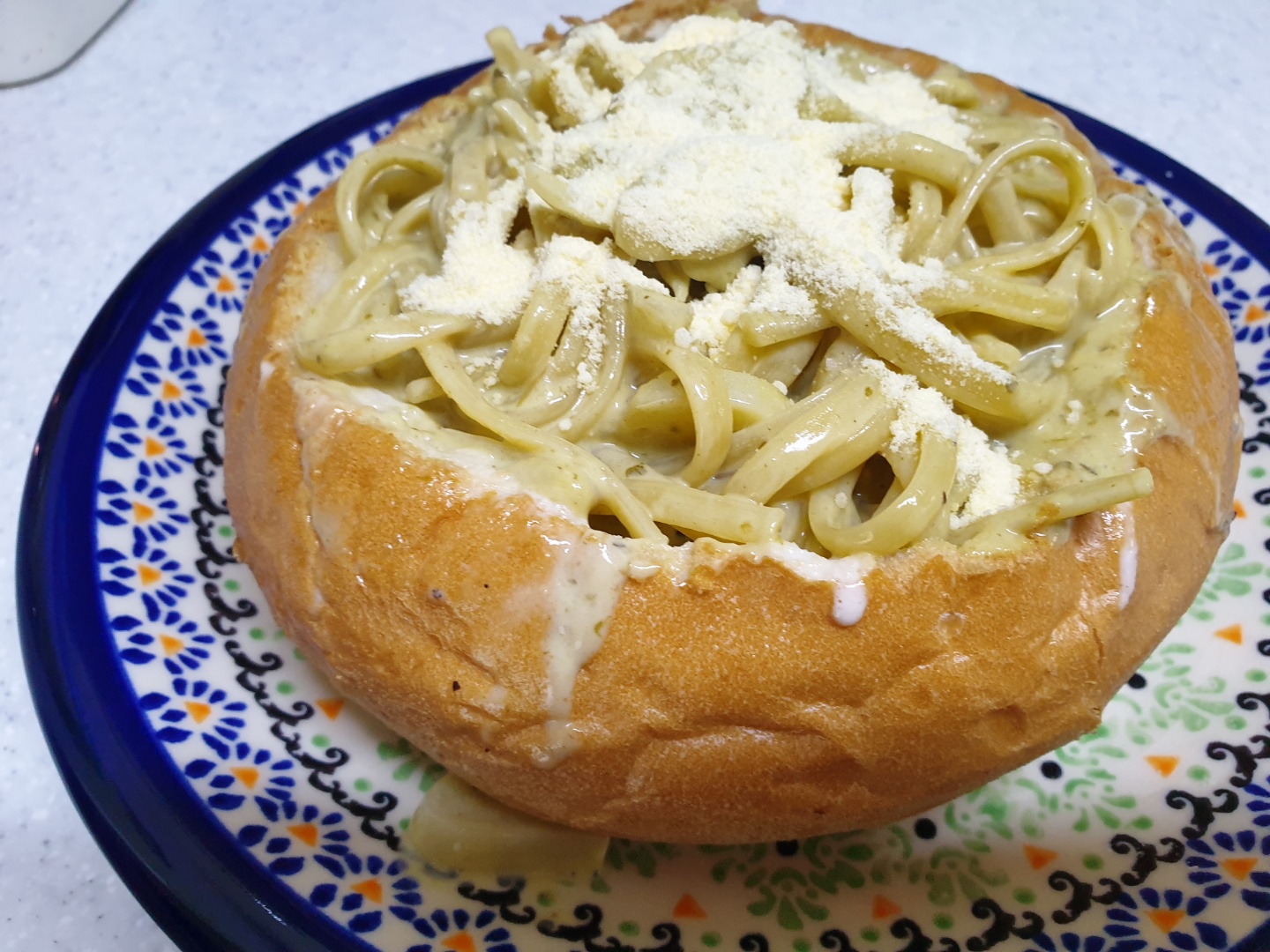 이렇게 만든 파스타를 속을 판 하드롤에 채우고 파마산 치즈를 뿌렸습니다.