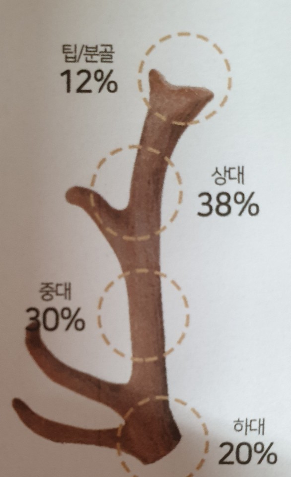 가장 좋은 부위는 세포활동이 일어나는 분골과 팁(생장정) 부위 입니다. 조직도 촘촘하고 좋은 성분으로 가득 담겨 있지만 적은 양 밖에 채취되지 않습니다. 고로 가격도 고가 입니다. 그 다음으로 상대, 중대, 하대 순으로 효과 및 가격 차이가 납니다.