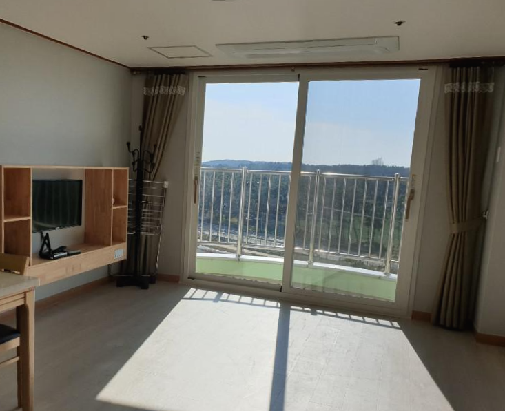 1) 방 겸 거실 - 도배, 바닥, 부엌, 샷시, 티비, 천장 에어컨, 식탁 모두 리모델링되었습니다.