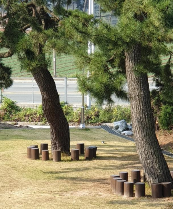 2) 멋지게 커피 한잔 할 수 있는노송나무 아래 나무 의자가 있습니다.