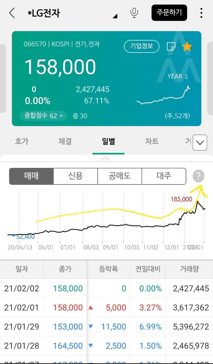 LG전자에서 휴대폰 사업부를 정리하겠다는 발표와 전장사업부를 키우겠다는 발표, 가전 매출의 급증, 4분기 매출의 급증 등 긍정적인 뉴스가 많아서 호재를 이루었기 때문일 것입니다.