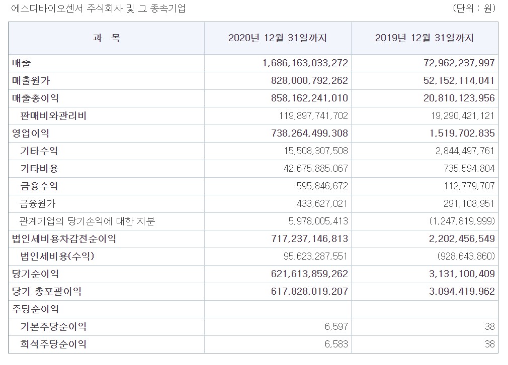 2020년 매출은 1조6,862억원, 영업이익 7,383억원이며 당기순익은 6,216억원입니다. 이 실적은 진단키트 대장주인 씨젠을 넘어선 수치입니다.